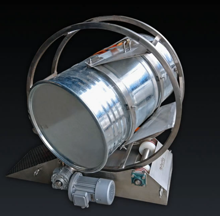 The drum filled with the mixing material serves as the mixing container and sits at an angle on the drum mounting on the drum hoop. When the mixing process is started, the drum hoop rotates onto the roller track and puts the drum into a tumbling motion. The angled drum position and the tumbling motion ensure intense blending of the components. Our GMP version is made out of AISI 304 and 316 Stainless Steel. Fixed 20 RPM or variable speed motor with digital display and timer option. Optional lockable caster wheels for mobility